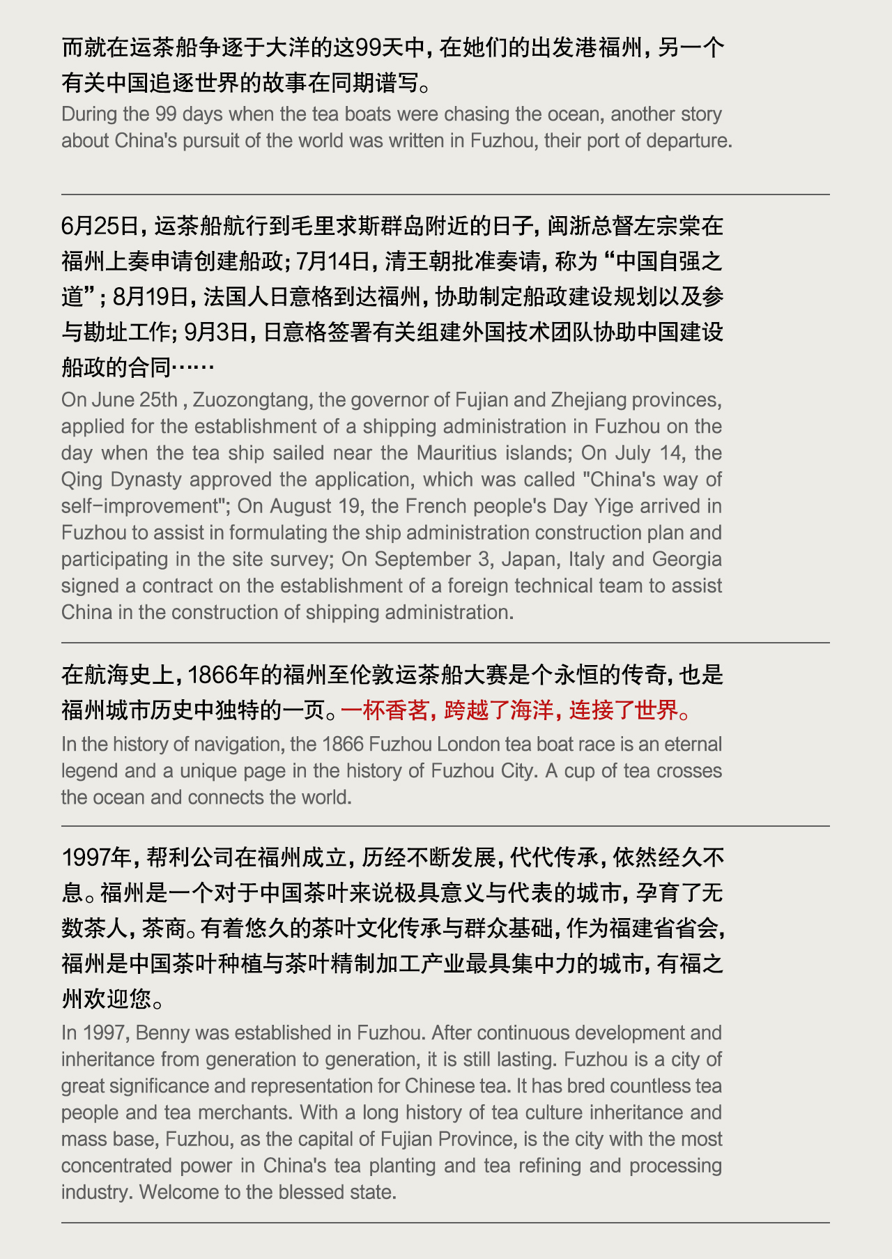 幫利公司起始于中國(guó)東(dōng)南(nán)部的(de)福建省省會(huì)福州,标志(zhì)性的(de)閩江在這(zhè)片土(tǔ)地(dì)分(fēn)流并交彙入γ海(hǎi)。上(shàng)世紀末,幫利公司在福州成立,開(kāi)始涉足茶飲行(xíng)業(yè),這(zhè)是(shì)關于一(yī)個( gè)家(jiā)庭追求夢想的(de)故事(shì),不(bù)僅僅是(shì)對(duì)茶飲,也(yě)是(shì)對(duì)這(zhè)片土(tǔ)地(dì)的(de)熱(rè≈)愛(ài)。經曆不(bù)斷發展,代代傳承,幫利從(cóng)最早的(de)奶茶門(mén)市(shì)生(shēng)意×,發展成一(yī)家(jiā)專注于餐飲用(yòng)茶與供應鏈的(de)公司,26 年(nián)來(lái),依然激情生(shēng)長(cháng)、繁榮、且經久不(bù)息。...